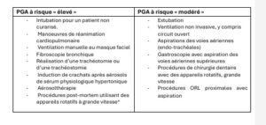 Tableau 1 : classification des procédures à risque de génération d’aérosols (PGA), d’après recommandations pour la prévention du risque respiratoire SF2H, 2014.